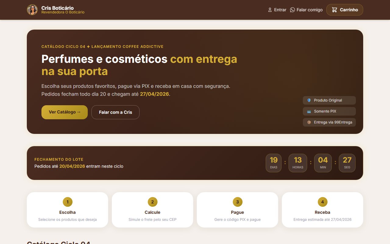 E-commerce de cosméticos e beleza com catálogo completo, carrinho e navegação fluida. Interface responsiva para o segmento beauty, hospedada na Vercel.